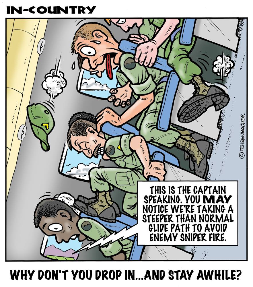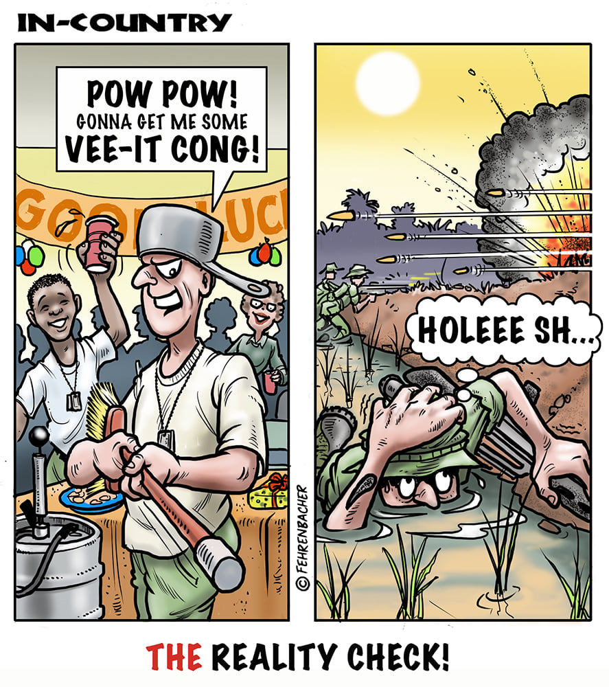 Phil enlisted in the Army in 1965 where you served for years in Vietnam. He became a graphic designer and has worked for the state of Oregon for 26 years. He retired in 2003 and started the Cartoon "In-Country". The cartoons reflect his experiences during his tour of duty in South Vietnam.